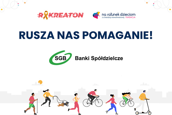 Banki Spółdzielcze SGB partnerem ogólnopolskiego wyzwania „RakReaton”. Kolejny raz zbieramy kilometry dla dzieci! Hasło „Rusza nas pomaganie” doskonale opisuje to, jak działamy w Zrzeszeniu SGB! Lubimy pomagać, szczególnie aktywnie – a udział w wyzwaniuRakReaton to dla nas kolejny sposób, żeby wesprzeć dzieci, które walczą z chorobą nowotworową.